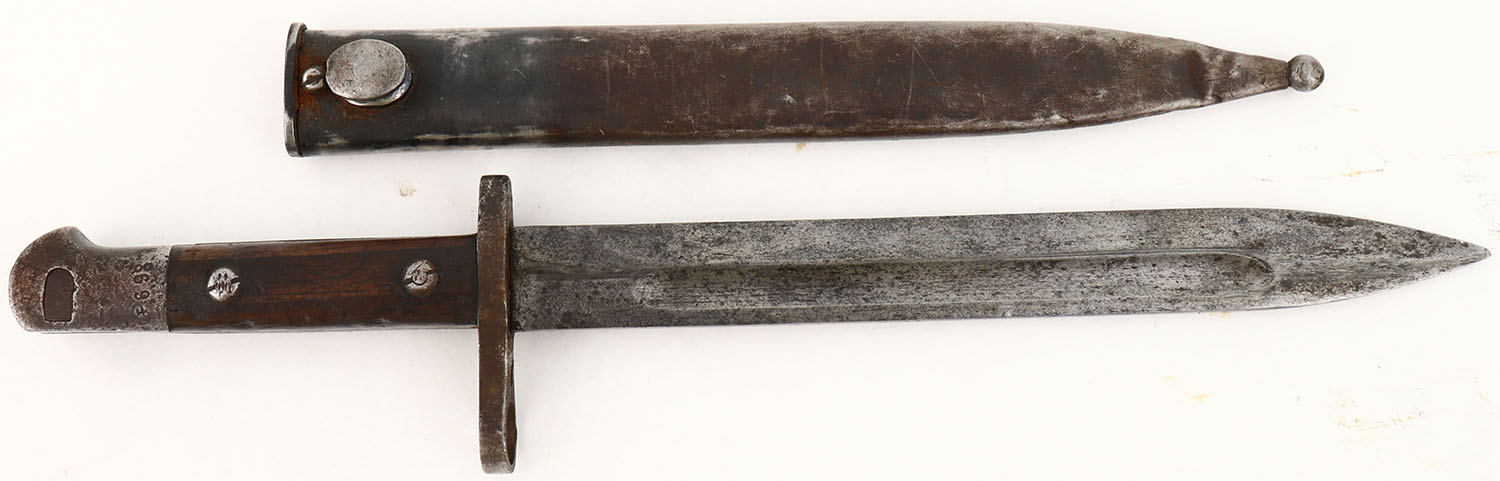 Turkish, Askari Fabrika, M1935 bayonet & sheath. The blade is bare metal & is covered in dark patina. The guard & pommel have toned to a dark, chocolate brown patina. The wood grips have small dings & wear. The right side of the pommel is marked ''AS.FA'', the left side is marked ''8694''. The sheath has finish wear, scratches & parts toning to a brown patina. Grade: Very Good + - Value: 30 to 90