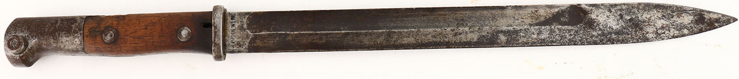 German, Samson Werk, M1884/98. The blade is bare steel with lots of dark patina, the guard & pommel are the same. The wood grips have small chips & wear. The right side of the blade is marked ''SAMSON WERK'', & the spine of the blade is marked with a crown proof. Based on the M1871/84 bayonet for the Mauser Gewehr 71/84 repeating rifle, but has been modified to fit on the Gew 98 Rifle. The first production run was converted M1871/84 bayonets, while the second run was new made bayonets, that ran from 1915-18. M1884/98 production was discontinued in favor of the M1898/05 bayonet (the classic butcher blade WW1 bayonet) since the troops preferred that model. However, the Germans would return to the M1884/98 design in 1915, as a way to use their limited steel supply more efficiently. Grade: Very Good - Value: 80 to 160