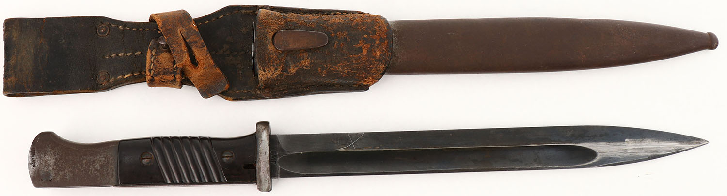 German, Staatliche Waffenfabrik Chatellerault (France), M1884/98 Third Pattern (K98k), bayonet, with S/N MATCHED sheath, & frog. The blade is blued & has sheath wear. The guard & pommel have finish wear, the pommel is toning to a brown patina. The black grips have scratches & wear. The left side of the blade is marked ''jwh'', & the right side is marked ''4912'', ''f''. The spine of the blade is marked ''42''. The left side of the pommel is marked with two Waffenamt proof marks. The sheath has wear & is toning brown. The sheath is marked with the same S/N that's on the bayonet. The leather frog has handling & age wear. The retention strap has a tear. The markings on the back of the frog are worn & faint, but the date stamp is slightly visible & appears to be 1943. Grade: Excellent - Value: 100 to 300