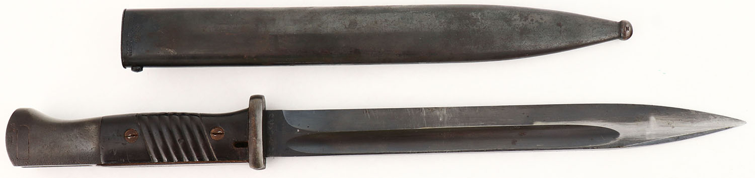 German, Ernst Pack & Sohne, M1884/98 Third Pattern (K98k), bayonet & sheath. The blade is blued & has sheath wear. The guard & pommel have light finish wear. The black grips have scratches & wear. The left side of the blade is marked ''E.PACK&S'', & the right side is marked ''2529'', ''F''. The spine of the blade is marked ''39''. The left side of the pommel is marked with two Waffenamt proof marks. The sheath is blued with finish wear, & areas toning brown. The sheath is marked ''GEBR HELLER'', ''1938'', ''1779''. Grade: Excellent + - Value: 80 to 160