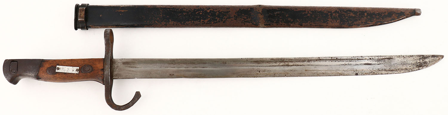 Japanese, Type 30 School/trainer Bayonet & sheath. The blade is bare steel with patina. The guard & pommel are toning brown. The wood grips have small chips & scuffs. The right grip has a metal tag that reads ''NO2''. The sheath has a black paint metal finish that's worn away in areas & toning to a rust brown. The sheath also has a few dings/dents, & has a small hole in one of the dents. Crudely made bayonet for use on school training rifles. School rifles and bayonets were used for military drill, which was a normal part of high school curriculum in Japan from the early 1930s through the end of the Second World War. School (or 'Trainer') rifles and bayonets were made in local workshops of scrap rifle parts, soft steel and cast metal. The rifles fired only blanks, caps, or were non-firing ''clicker'' models. The fit and finish of these bayonets are inferior to the Army issue pieces, as they weren't expected to stand up to the rigors of service use. Japanese Army and Naval Landing Forces used regular service bayonets for bayonet training. Grade: Very Good + - Value: 60 to 120