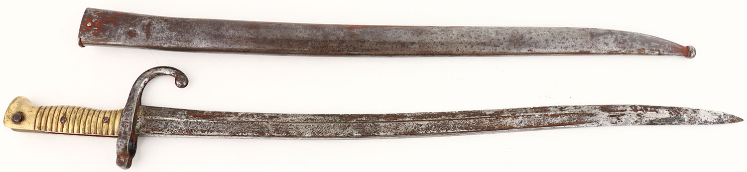 French, M1866 Chassepot, Yataghan sword bayonet, & sheath. The blade is bare steel, with dark brown patina/ light rust, & raised/cleaned pitting all over the blade. The edge has lots of small nicks & chips. The guard & handle also have patina. The left side of the blade is marked ''P.D.I'', ''C'' in a circle. The left side of the guard is marked ''U 35682''. The sheath has a spots of orange/red paint, & has spots of patina & finish wear. The sheath has been heavily buffed & cleaned. Yataghan sword bayonet for use on the 11 mm. M1866 Chassepot needle-fire rifle, which was France's first cartridge fed rifle. Grade: Very Good + - Value: 100 to 200
