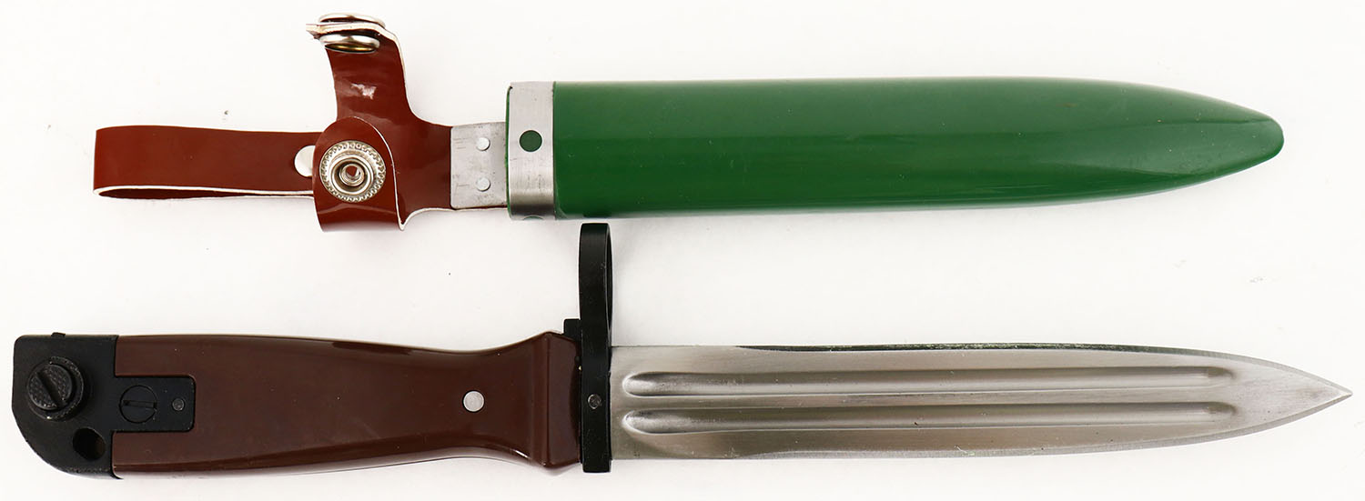 Chinese, Type 81 Bayonet sheath & frog, Modern Reproduction. The blade has no visible wear, same with the guard, grip, & pommel. There are no markings on the bayonet or sheath. The green plastic sheath has scuffs & scratches. Although the Type 81 borrows from the Type 56 Rifle (AK47), Type 56 Carbine (SKS), and Dragunov designs, it is a totally new rifle. As a result, the Type 81 bayonet will not mount to any other Kalashnikov rifle. This is a commercial, Modern reproduction of the Type 81 Bayonet. Grade: Excellent ++ - Value: 30 to 90