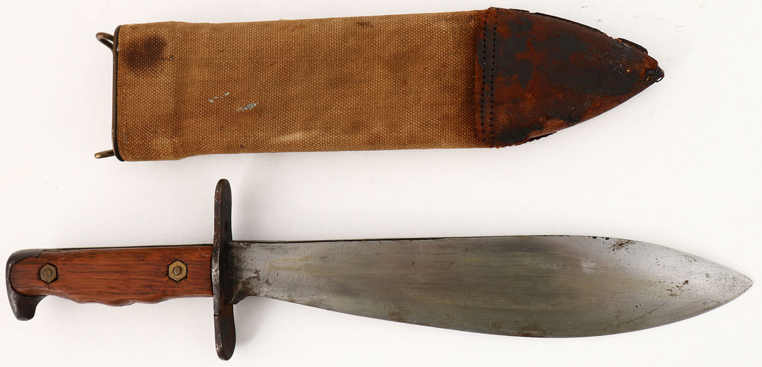 US, Fayette R. Plumb Co., M1917 C.T. Bolo knife, with sheath. The blade has been cleaned/buffed leading to markings being faint/partially obliterated, blade still has a few spots of patina & cleaned pitting. The guard & pommel have light rust/ brown patina. The guard has a crack halfway through it. The wood grips have small chips & wear. The markings on the left side of the are partial from being buffed, but what is visible reads ''P'', ''ST.LOU'', ''191?''. The markings on the right side are the same & read ''S.MOD'', ''1917 C.T.''. The canvas/leather sheath has heavy wear & age soiling, from use/age, & there are no visible markings. Heavy bolo knife for use by machine gun and artillery crews to clear vegetation when emplacing their guns. According to noted U.S. military knife authority Frank Trzaska, the C.T. stands for ''Commercial Tolerances.'' This signifies that the knife was made to less exacting commercial tolerances, rather than the more stringent tolerances used at Springfield Armory. Grade: Very Good - Value: 150 to 350