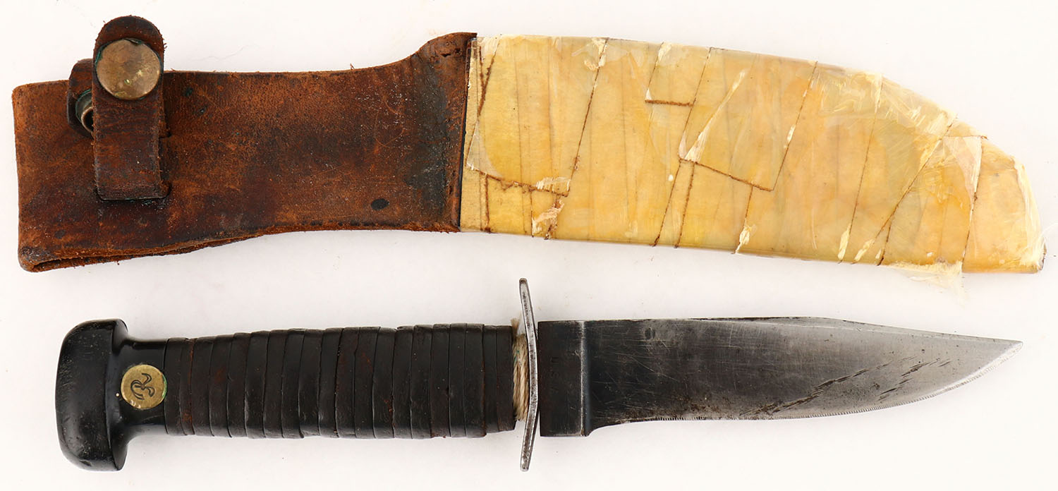 US, Henry Boker & Co., USN Mk1 knife, WW2 production. Blade has finish wear, scratches & small spots of patina. The grips is a stacked leather washer construction. Comes with a leather sheath wrapped in tape. The USN MK1 was simply a 5'' blade knife bought by the hundreds of thousands by the Navy for issuing to sailors crewing landing craft, support boats, deck work aboard ship in general. The Navy PTB decided that sailors needed 5'' knives for such work. Unlike the 1219C2/USN-MK2 which had specific criteria to meet, the specs for the USN-MK1 was essentially, make a knife with a 5'' blade. Grade: Very Good + - Value: 30 to 60