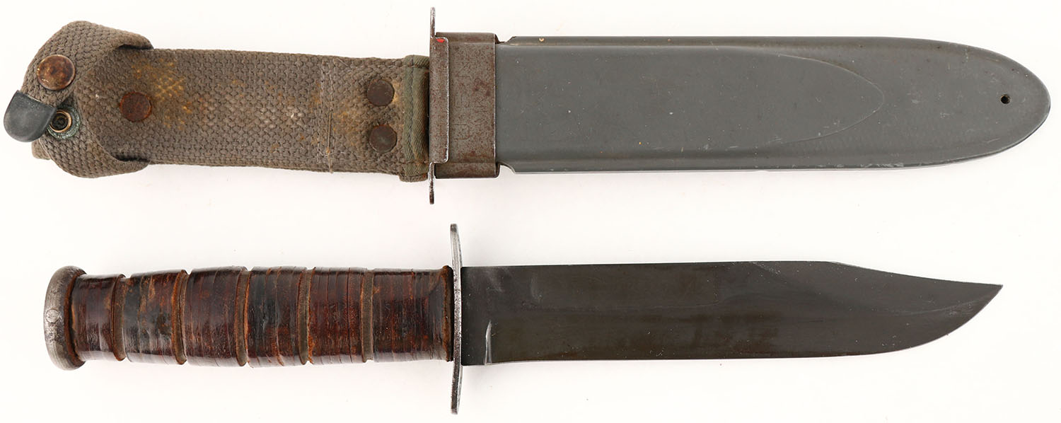 US, KA-BAR (Union Cutlery), USN MK2 knife & sheath. Blade has light wear & one spot of cleaned light pitting. The leather grips have light wear. The top of the guard is marked ''KA-BAR'', ''USN MK2''. The sheath has scuffs & wear. The sheath is marked ''U.S.N.'', ''MK2'', ''NORD-6581'', ''B.M.CO.'', ''/8'', &''VP'' over two stars. Grade: excellent - Value: 50 to 150