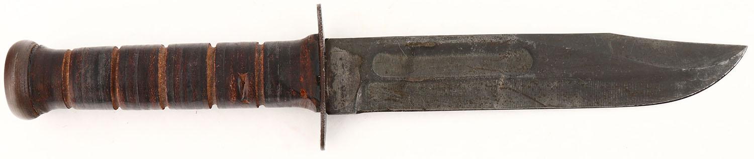 US, MK2 knife. The markings on both sides of the blade have been ground off. Blade has wear & spots starting to tone brown. The leather grip has light wear. Grade: Very Good - Value: 30 to 60