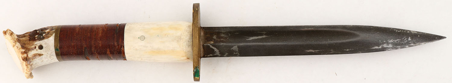 US, Theater made fighting knife, made from a German dress bayonet. Blade has spots of finish thinning. The grip is made from leather & real stag. Grade: Very Good ++ - Value: 30 to 60