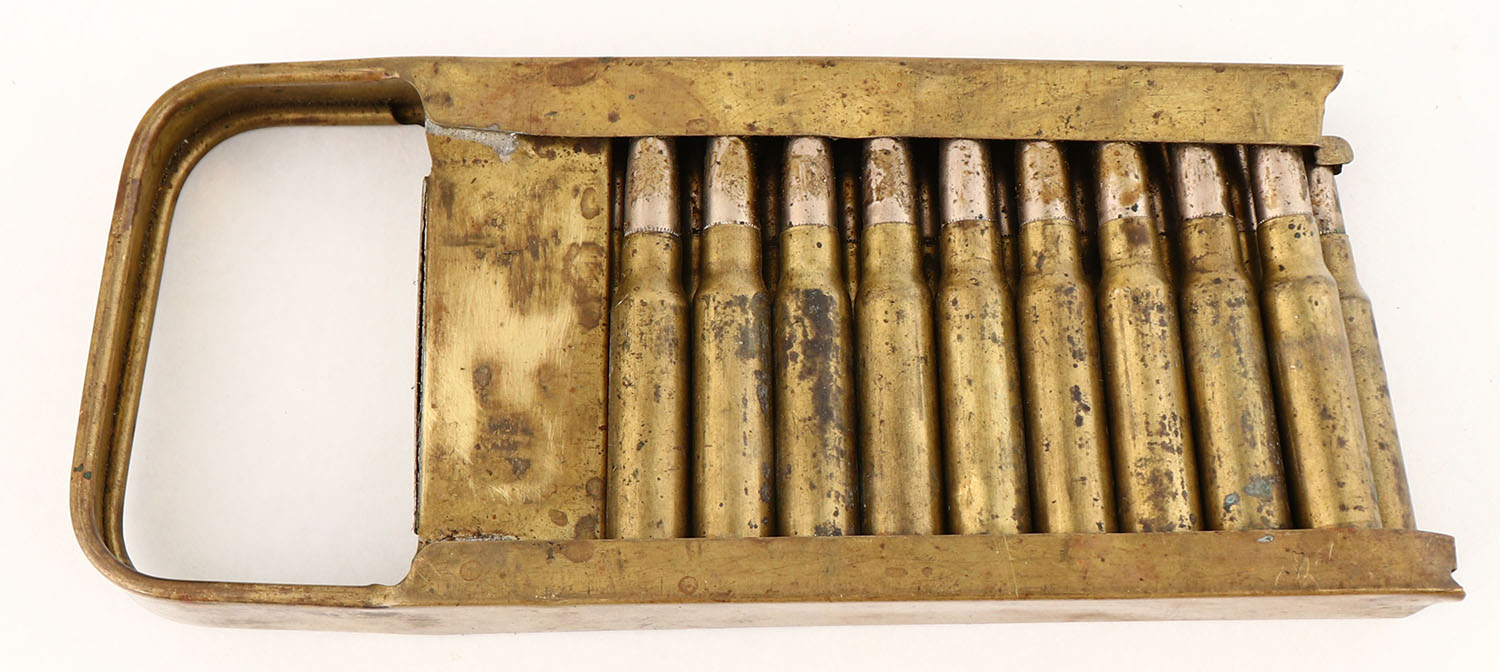 Italian Breda Modello 30 stripper clip, brass clips with 20 Rds. Of 7.35 x 51mm Carcano. Ammo is good. Grade: Very Good + - Value: 20 to 40