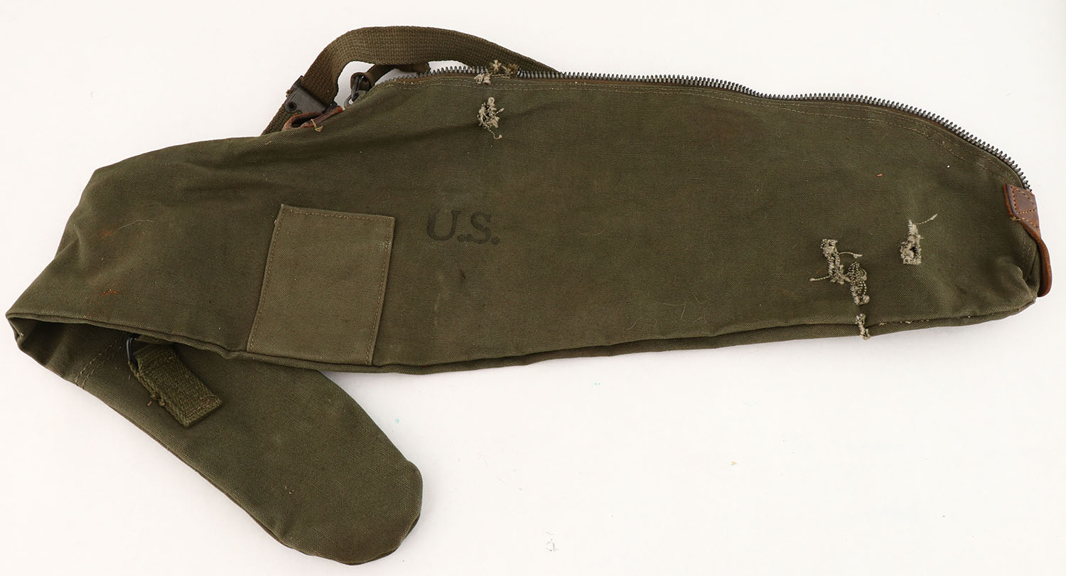 US, M1 Carbine carrying case, Shane MFG Co., 1944 dated. The case's zipper has some damage to the teeth & wont zip all the way. Case has other small stains & rub marks. Grade: Very Good - Value: 30 to 60