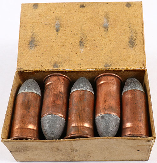 RARE!!, Frankford Arsenal, .58 Musket Cartridges, Benet primed, 1pc, Full with 10 Rds.. Buff box, box has three glued repaired seams, light pen marks on the back, light handling wear, & a few small stains, ammo is excellent. Grade: Very Good ++ - Value: 150 to 300