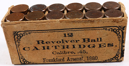 RARE!! Frankford Arsenal, Cal .45 Revolver Ball Cartridges, dated 1880, 1pc, Full. Buff box & label with black print. The box is missing the top, has light edge wear & handling wear. The ammo ranges from very good to excellent. Grade: Very Good + - Value: 100 to 150