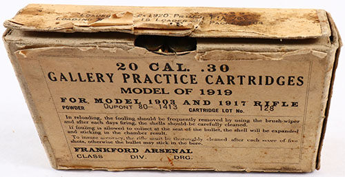 Frankford Arsenal, Cal .30 Model of 1919 Gallery Practice cartridges (.30-06), for model 1903 & 1917 rifle. Dated nov 1920. Cart Lot 128. 1pc, Partial 19 Rds. One other Rd. has a dent in the primer, but the Rd. still has powder inside & the original bullet, it was either a light strike or the Rd. was a dud. Buff box & label with black print. The box is solid with light age soiling, stains, rub marks & edge wear. Ammo is very good. Grade: Excellent - Value: 20 to 40