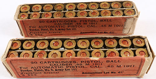 Lot of two, Frankford Arsenal, Cal. .45 M1911 Ball, ammo boxes, both are from Cart Lot 412. 1pc boxes, both full, brown boxes with red label; & black print, boxes have the tops missing & the seams are falling apart. Ammo is very good. Grade: Good ++ - Value: 20 to 40