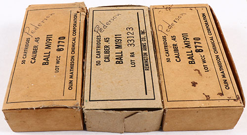 Lot of three, 50 Round Cal .45 M1911 Ball, ammo boxes, two Olin, one Remington, all full (150 total Rds.) ammo ranges from very good to good. Grade: Very Good + - Value: 40 to 100