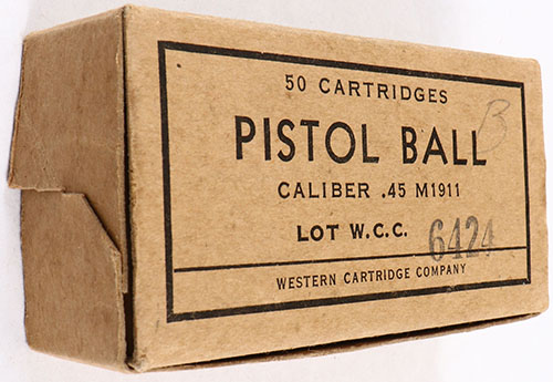 Western, .45 M1911 Ball, Lot W.C.C. 6424, 1pc, Full, brown box with black print, box has light handling wear, & pencil marks, ammo is very good. Grade: Excellent + - Value: 20 to 40