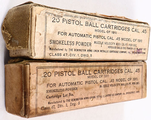 Lot of two, Remington, .45 M1911 Ball, 20 Rd. boxes, 1pc, both FULL & SEALED , buff box with black print, boxes have age soiling & rub marks. Grade: Very Good ++ - Value: 20 to 40