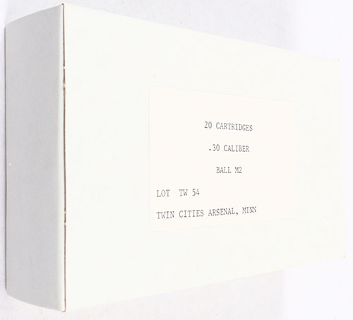 Twin Cities Arsenal, .30 Cal M2 Ball, Lot TW 54, 1pc, Full, white box & label with black print, box is solid with minor wear, ammo is excellent. Re-boxed surplus military ammo. Grade: MINT - Value: 10 to 30