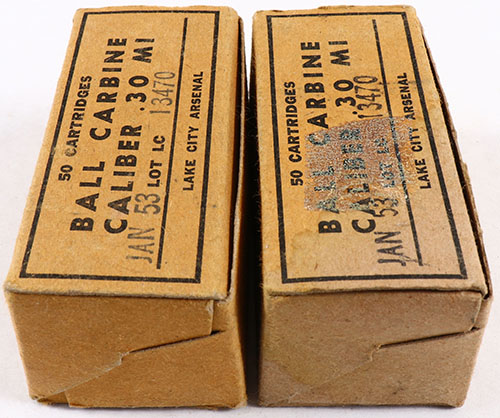 Lot of two, Lake City, .30 carbine M1 Ball, both have the same lot LC 13470, dated Jan 1953, 1pc, both Full but one box has all hollow point bullets with the correct H/S. brown boxes with black print, boxes have stains & wear, ammo is very good to excellent. Grade: Excellent - Value: 30 to 60