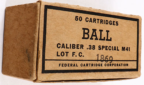 Federal, .38 Special M41 Ball, Lot F.C. 1869, 1pc, Full, brown box with black print, box is solid with handling wear, ammo is very good. Grade: Excellent - Value: 20 to 50