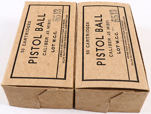 Lot of two, Olin, .45 M1911 Ball. 1pc, both full, brown box with black print, boxes have light wear, ammo is very good. Grade: Excellent - Value: 30 to 60