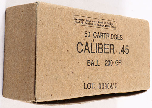 Israeli Military Industries (IMI), .45 Ball (.45 ACP), lot 00804/C, 1pc, Full, brown box with black print, box is solid with light wear, ammo is excellent. Grade: Excellent ++ - Value: 20 to 50