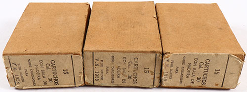 Lot of three, FN, .30 Fusil Mauser F.N. 1958 (30-06) on clips, 15 Rd. boxes, all full, brown boxes with buff label & black print, boxes have rub wear & edge wear, ammo is very good & is possibly corrosive. Grade: Very Good ++ - Value: 30 to 60
