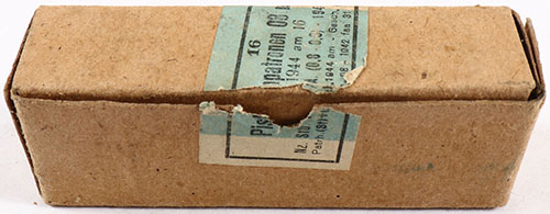German, Pistolpatronen 08 m. E. (9x19mm), dated 1944, 16 Rd. packet, 1pc, Full, buff box with buff/blue label & black print, box is solid with tears in label, ammo is excellent. Grade: Excellent - Value: 20 to 40