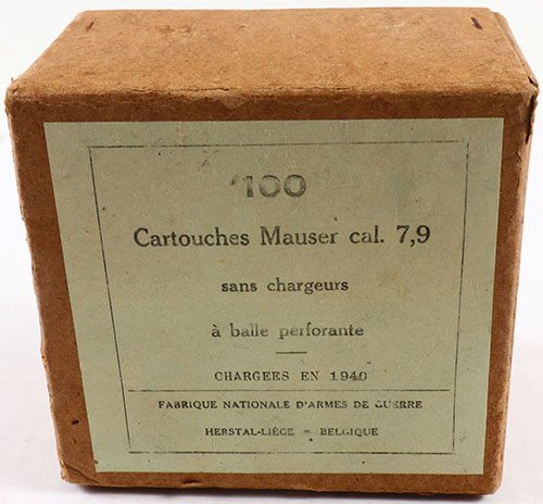 FN, 7.9 Cartouches Mauser (8mm Mauser), A Balle Perforante, 100 Rd. box, dated 1940, 2pc, Full, brown box with green label & black print, box has rub marks & edge wear, ammo is very good & is corrosive. Grade: Excellent - Value: 50 to 100