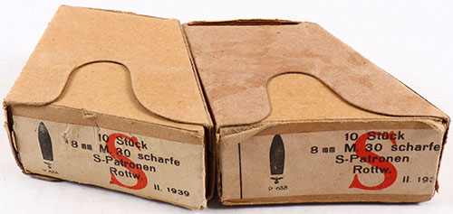 Lot of two Austrian, 8mm M.30 Scharfe S-Patronen (8x56mmR), 10 Rd. boxes on clips, 2pc, all Full 20 total Rds. On clips, boxes are solid with some light rubbing wear, ammo is dated 1938-1939. ammo is very good. Grade: Very Good ++ - Value: 10 to 30