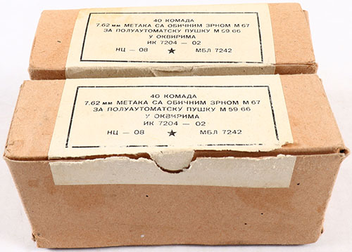 Lot of two, Yugo, 7.62x39mm M67 on clips, 40 Rd. boxes, 1pc, both full, brown boxes with buff label & black print, boxes have label tears & light wear, ammo is excellent but corrosive. Grade: Excellent - Value: 40 to 80