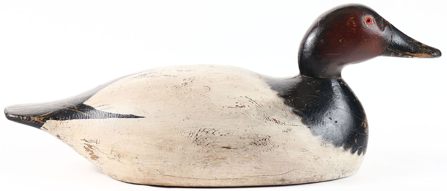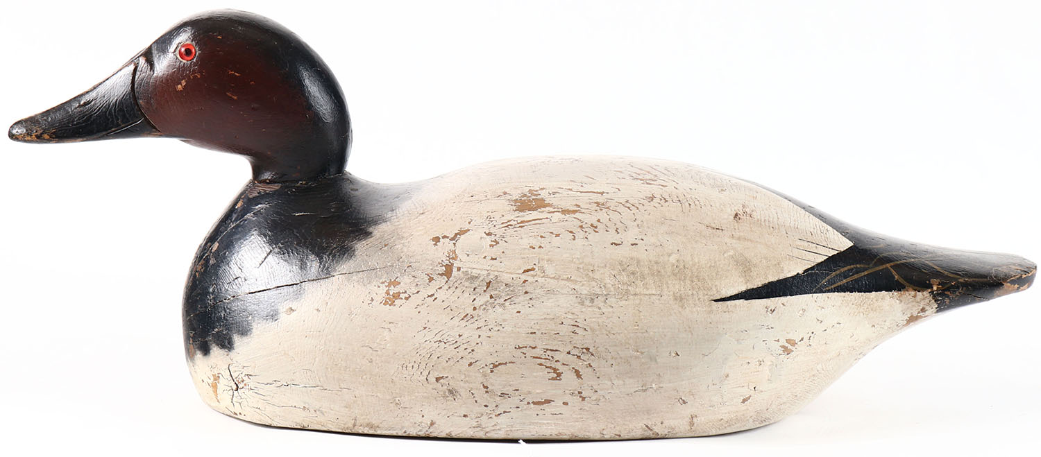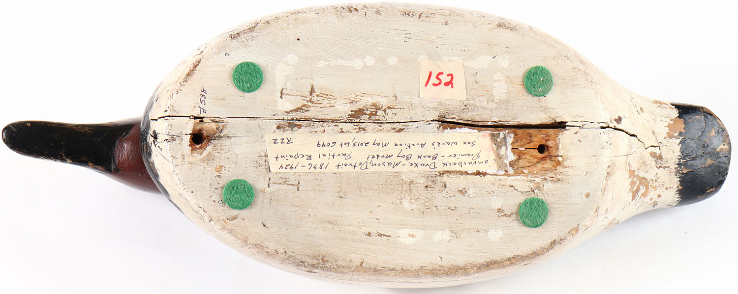 Back Bay Model Canvasback Drake by Mason Decoy Company, Detroit, MI, 1896-1924, over-sized, glass eyes, solid wood, has age crack on bottom, restored paint. Grade: Very Good + - Value: 100 to 200