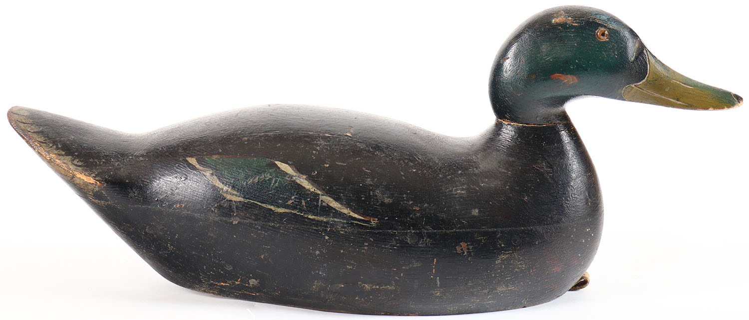 Premier Mallard Drake by Mason Decoy Company, Detroit, MI, 1896-1924, glass eyes, hollow wood, some original paint, mostly on the head otherwise old hunter strengthening, paint, structurally excellent. Original Mason weight. Grade: Excellent - Value: 100 to 200