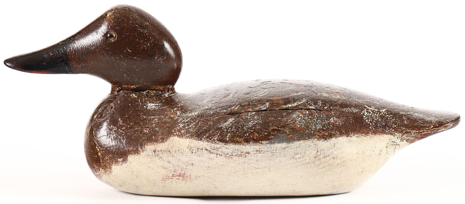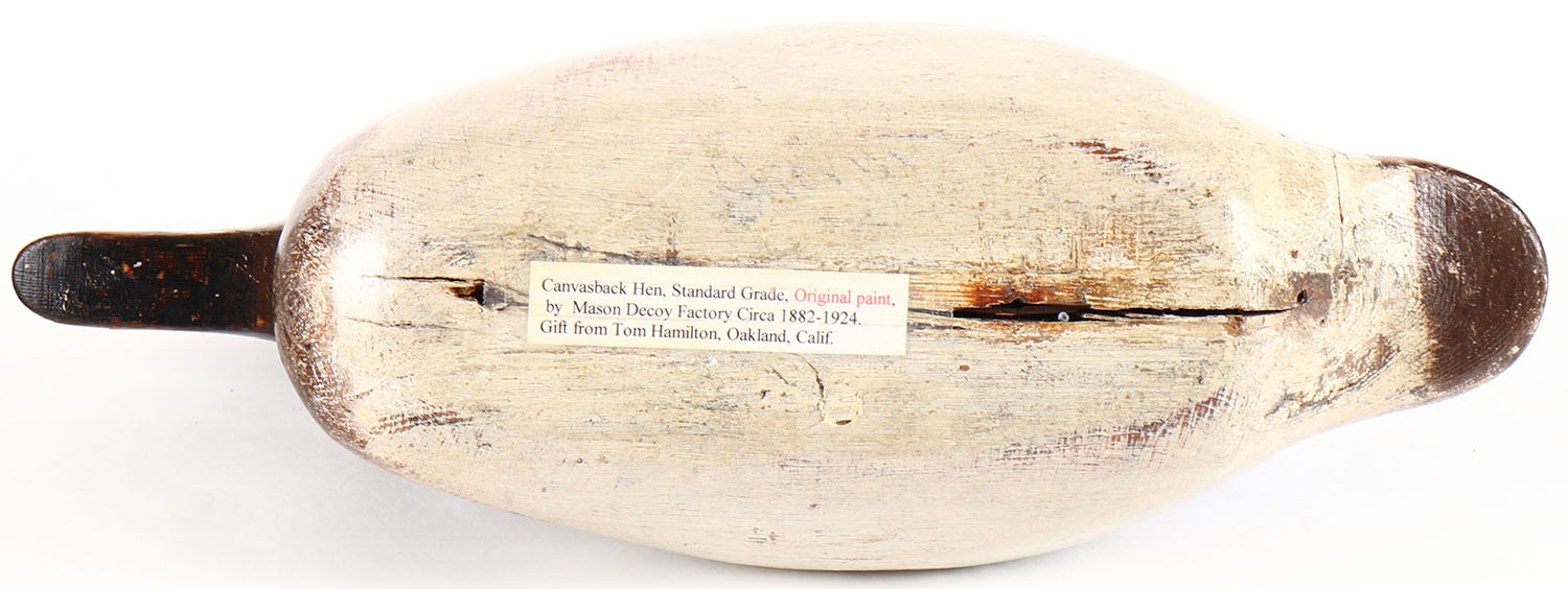 Canvasback Hen by Mason Decoy Company, Detroit, MI, 1896-1924, Standard Grade, glass eyes, mostly original paint with some strengthening to the white on the body, solid wood, has age cracks on bottom and back. Grade: Very Good ++ - Value: 100 to 200