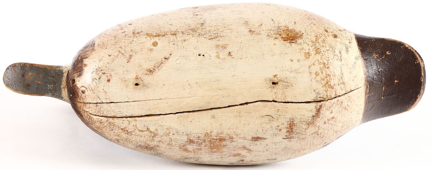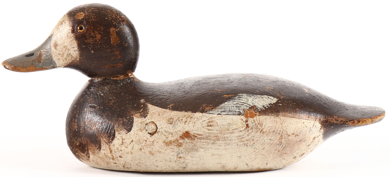 Bluebill Hen by Mason Decoy Company, Detroit, MI, 1896-1924, Standard Grade, late model, glass eyes, solid wood, original paint, has age cracks on bottom. Grade: Very Good + - Value: 100 to 200