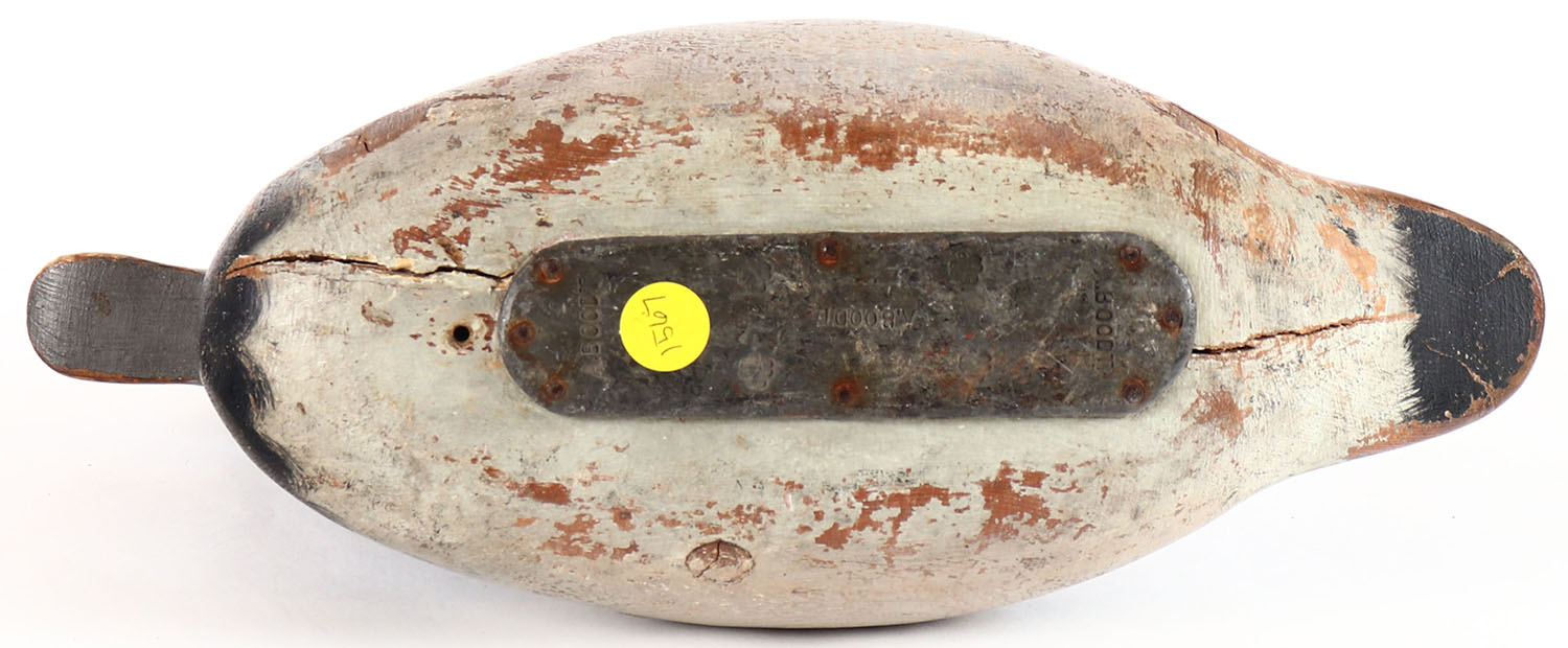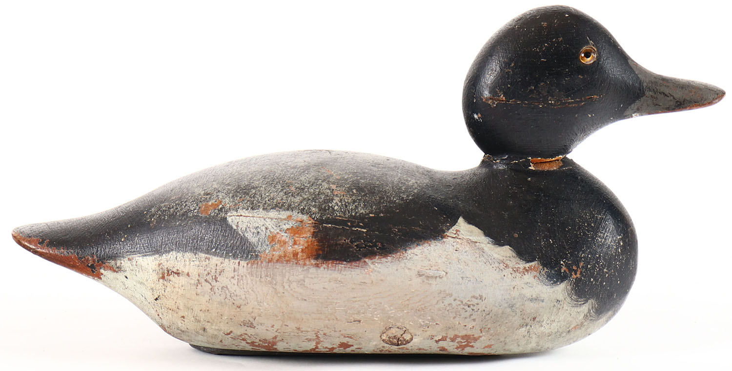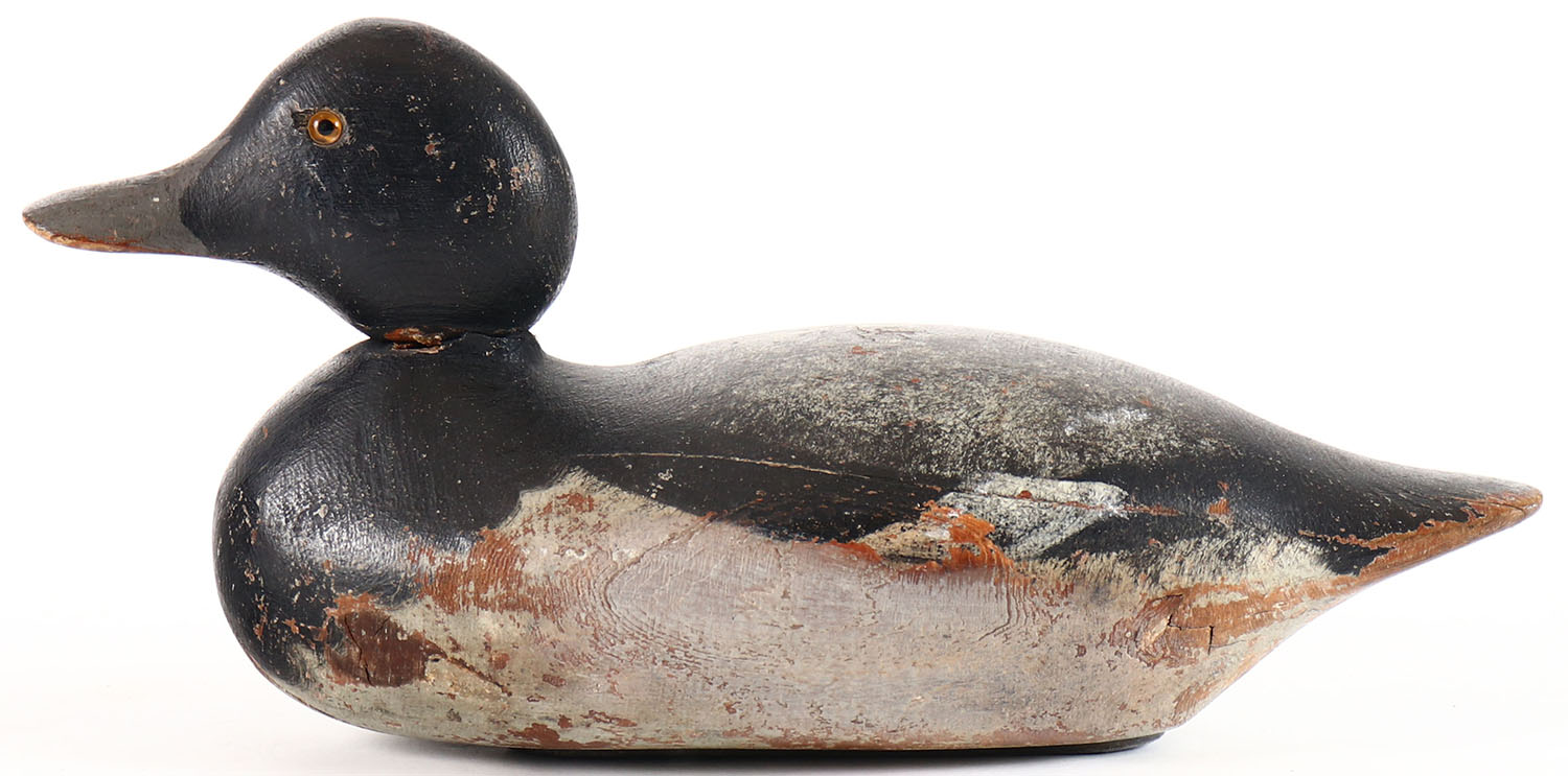 Bluebill Drake by Mason Decoy Company, Detroit, MI, 1896-1924, Standard Grade, glass eyes, solid wood, original paint, has age cracks on bottom. Grade: Very Good ++ - Value: 50 to 200