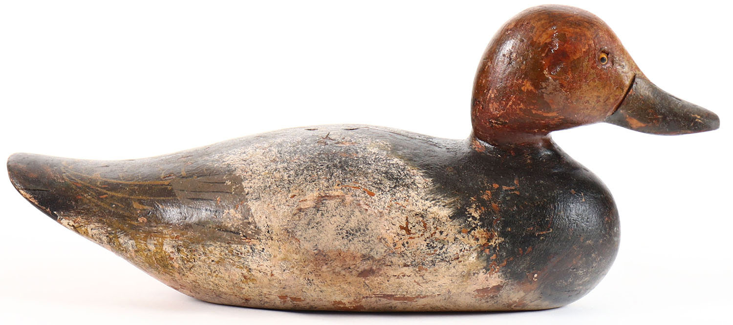 Redhead Drake by Dodge Decoy Factory, Detroit, MI, 1883-1893, Standard Grade, glass eyes, solid wood, worn apparent all original paint. Grade: Excellent - Value: 200 to 300