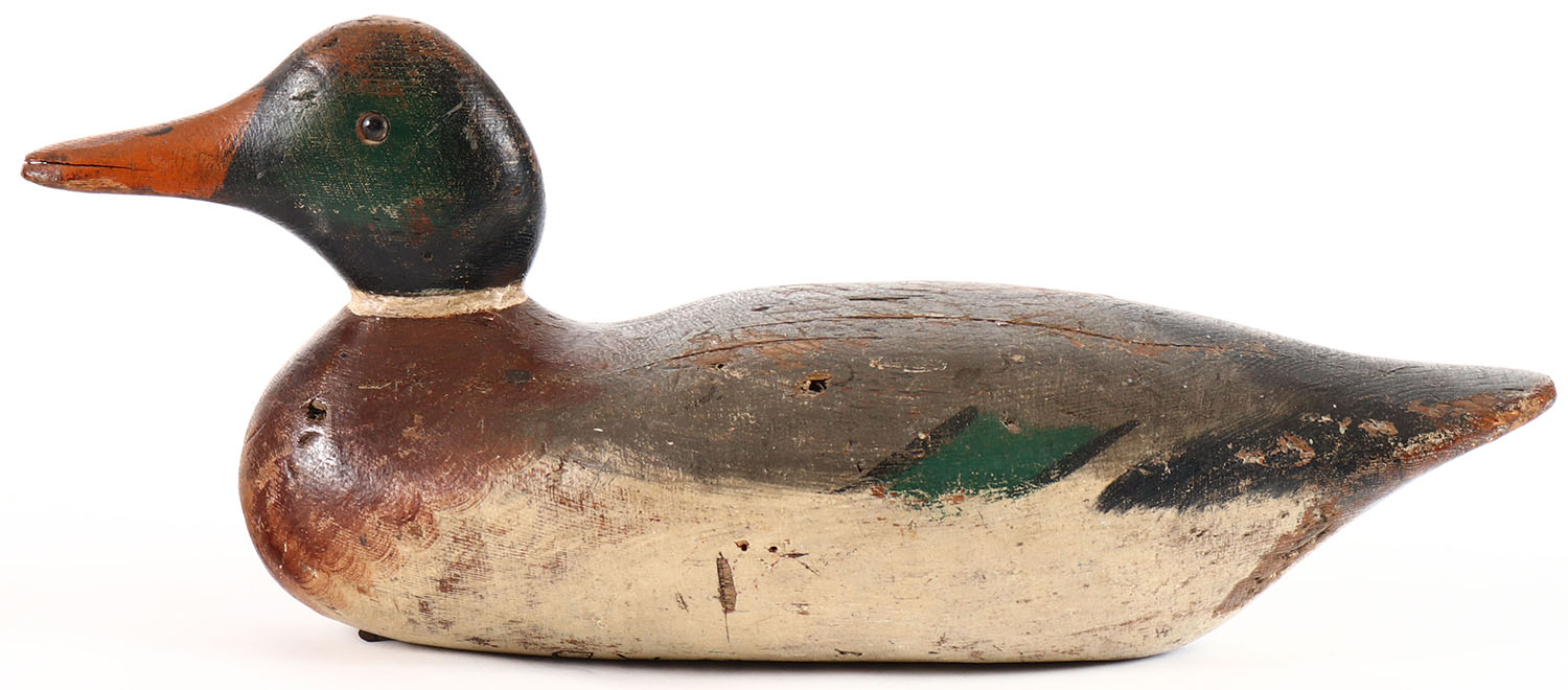 Mallard Drake by Mason Decoy Company, Detroit, MI, 1896-1924, early model Standard Grade, glass eyes, original paint, solid wood, has age cracks on back. Grade: Very Good + - Value: 50 to 200