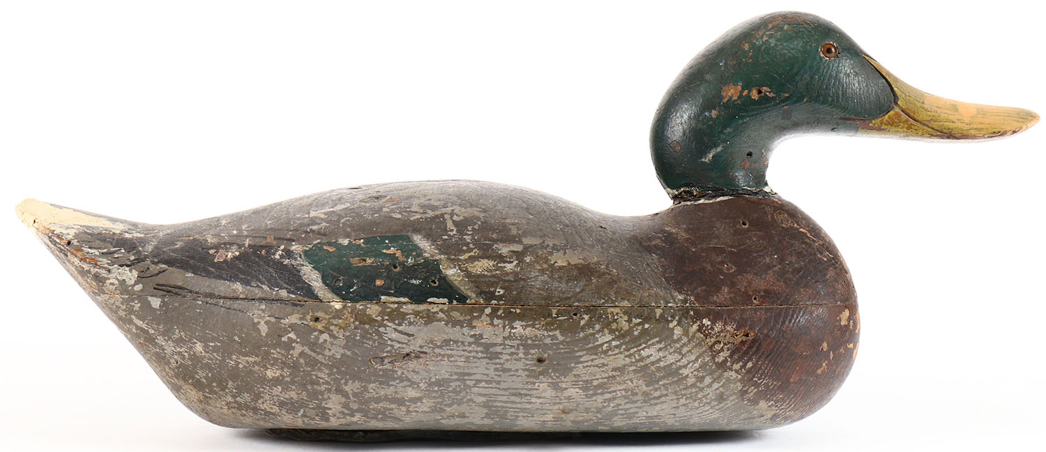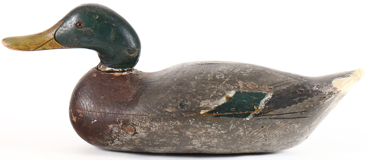 Mallard Drake by Mason Decoy Company, Detroit, MI, 1896-1924, Challenge Grade, glass eyes, solid wood, combination of original paint and overpaint, tail shows signs of wear. Grade: Very Good + - Value: 100 to 200
