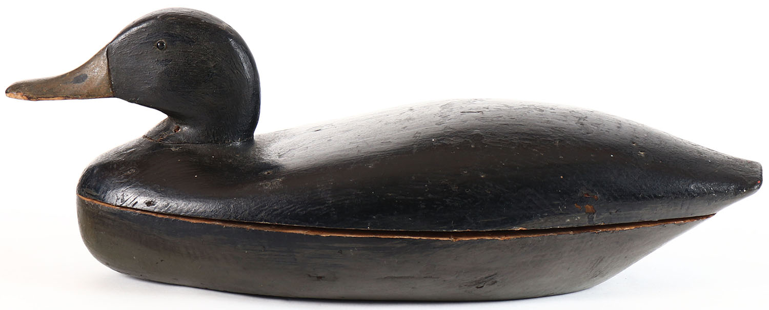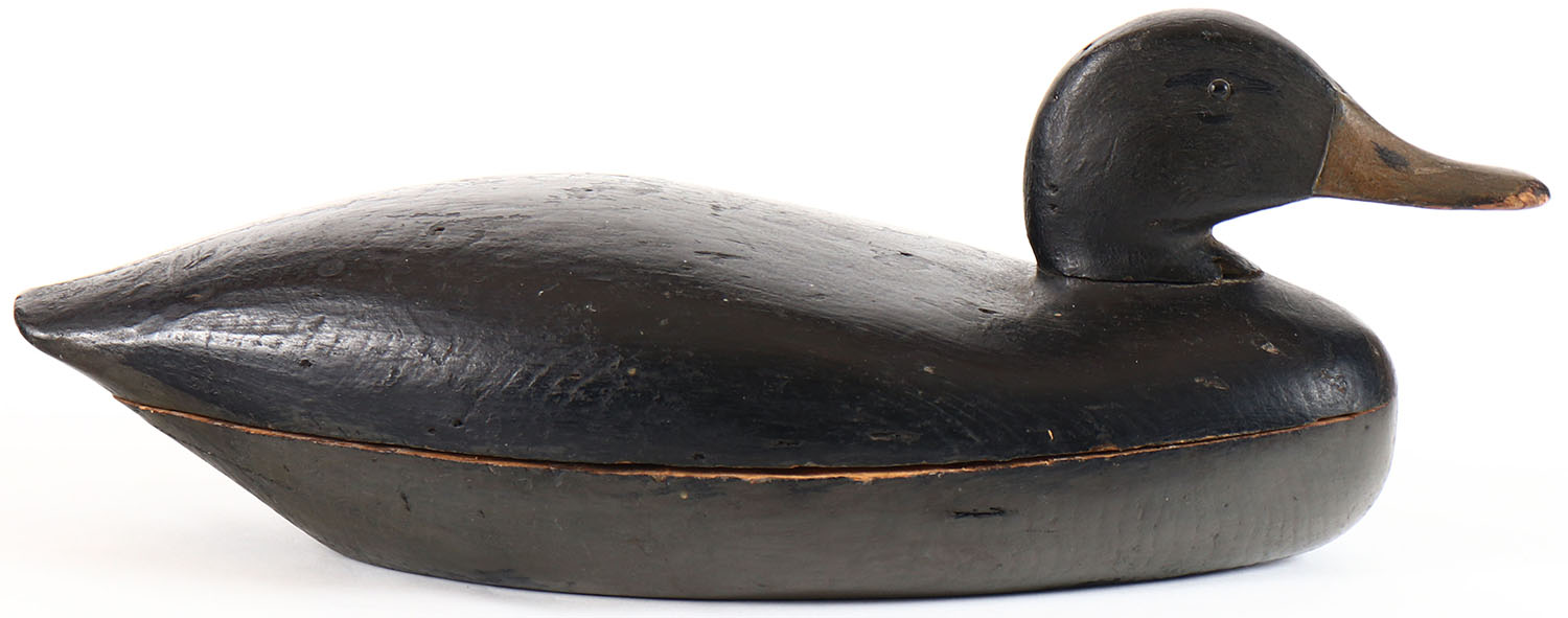 Black Duck by unknown possibly Pennsylvania maker, glass eyes, hollow wood, very old working repaint. Grade: Very Good + - Value: 26 to 100