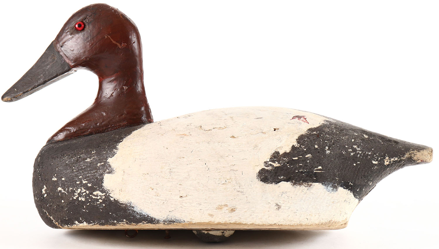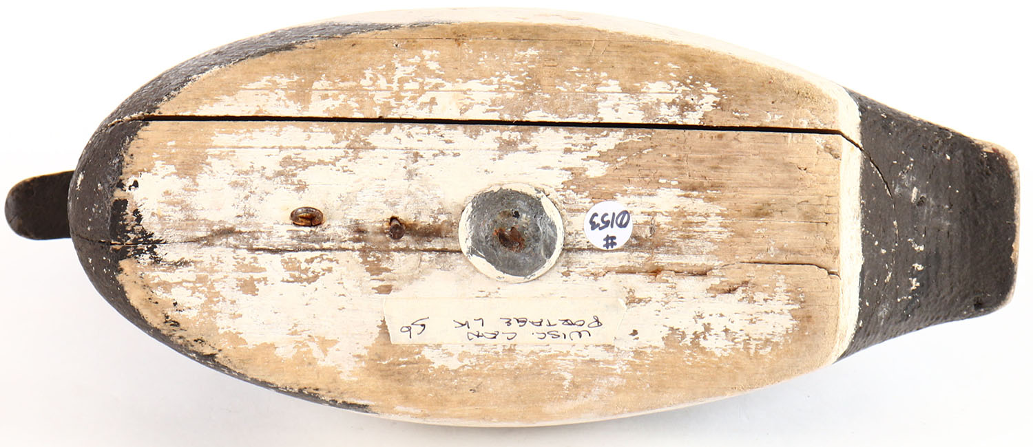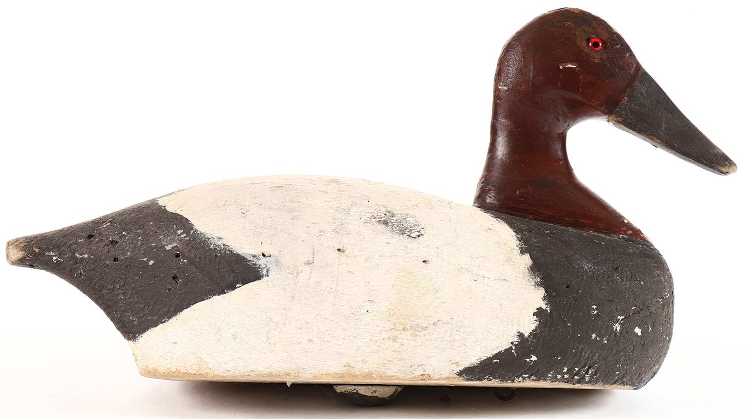 Canvasback Drake by unknown Wisconsin maker, glass eyes, solid wood, old working repaint, structurally excellent. Grade: Excellent - Value: 30 to 60