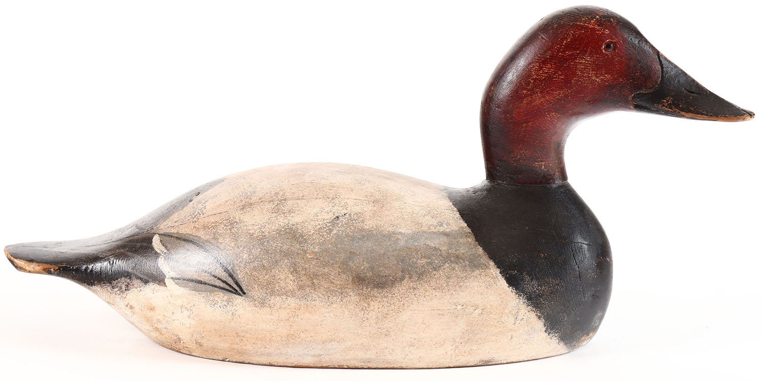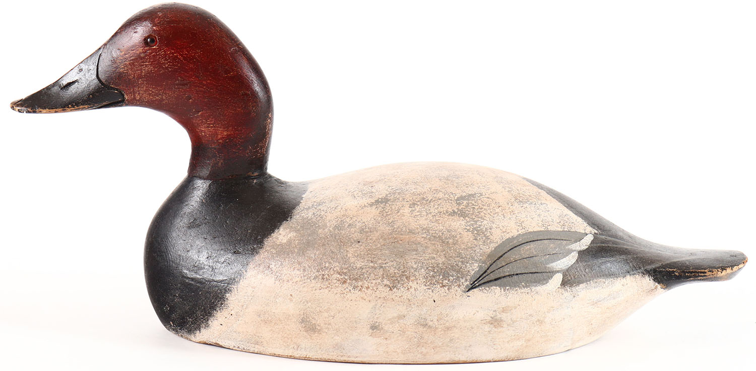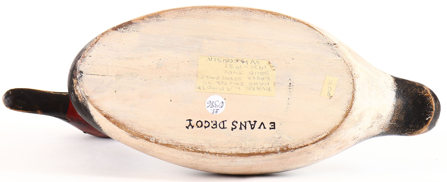 Canvasback Drake by Evans Decoy Company, Wisconsin, Mammouth, glass eyes, solid wood, restored paint, has age cracks on back. Grade: Very Good + - Value: 70 to 150
