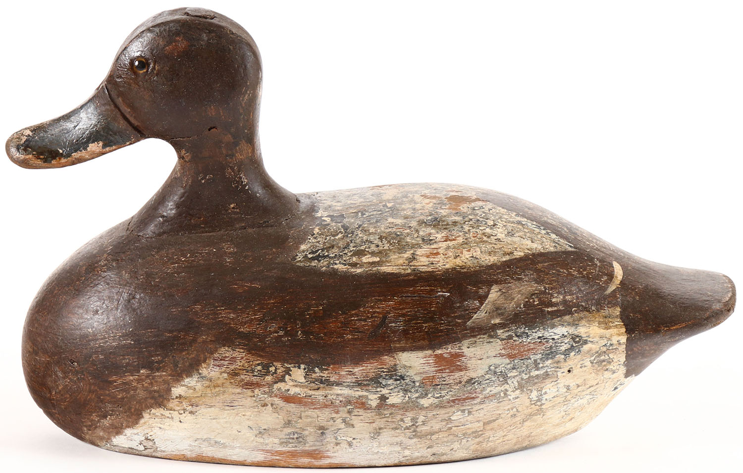 Bluebill Hen attributed to Gus Nelow, Wisconsin, glass eyes, solid wood, shows mostly restored paint, has age cracks on back. Grade: Very Good ++ - Value: 50 to 100