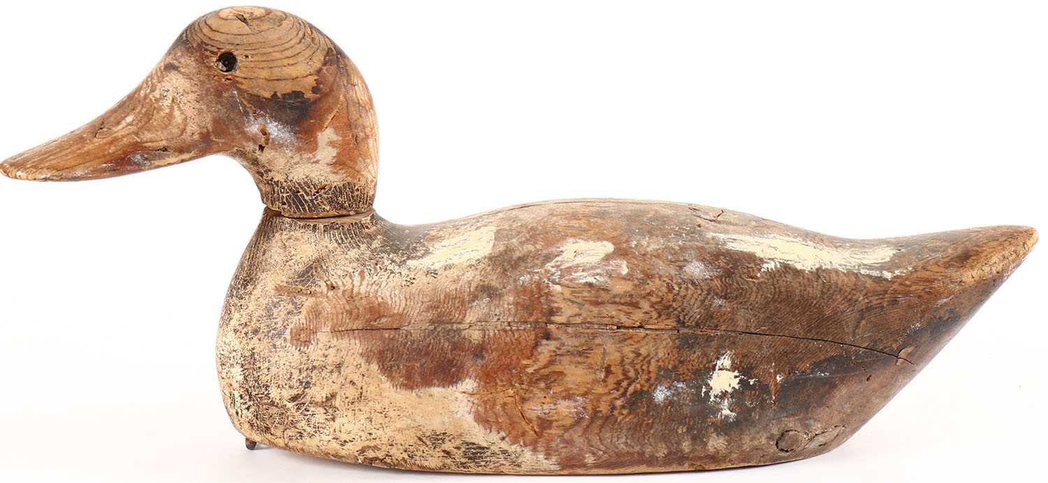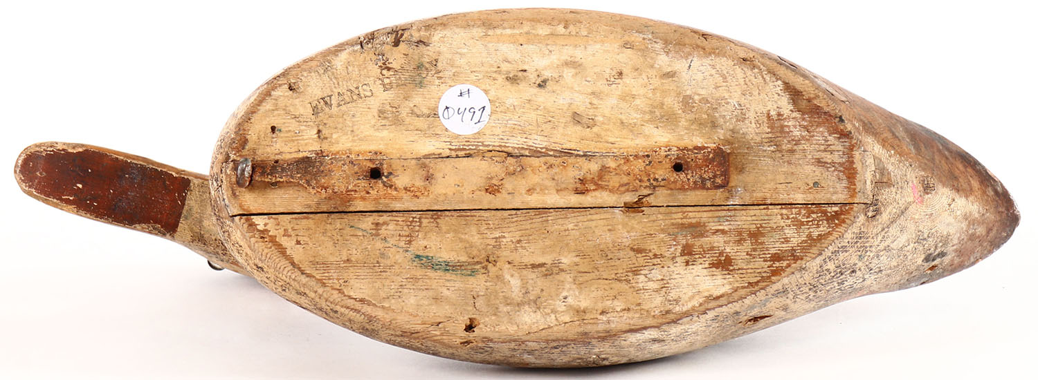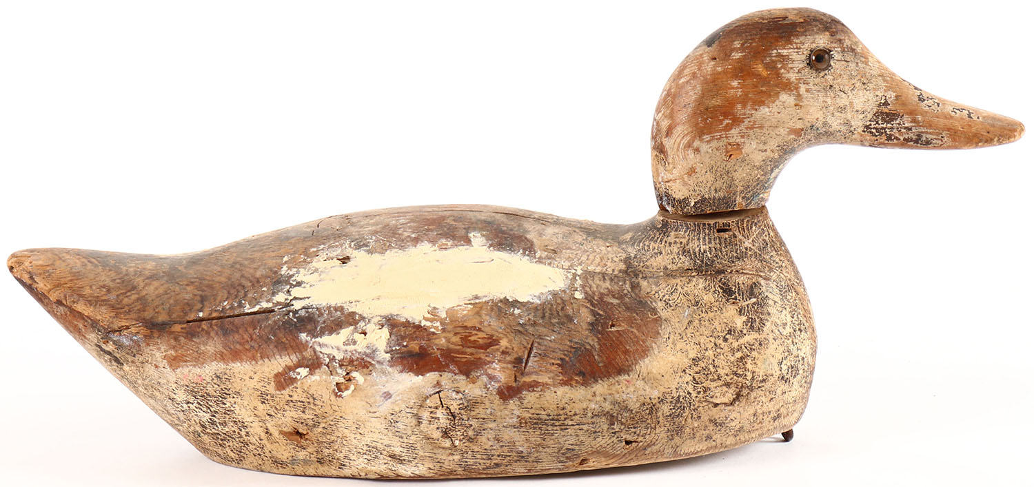 Mallard Hen by Evans Decoy Company, Ladysmith, WI, 1921-1932, glass eyes, solid wood, has age cracks on back with old puddy repair, remnants of original paint, head is loose. Grade: Very Good + - Value: 20 to 40