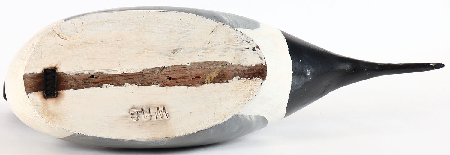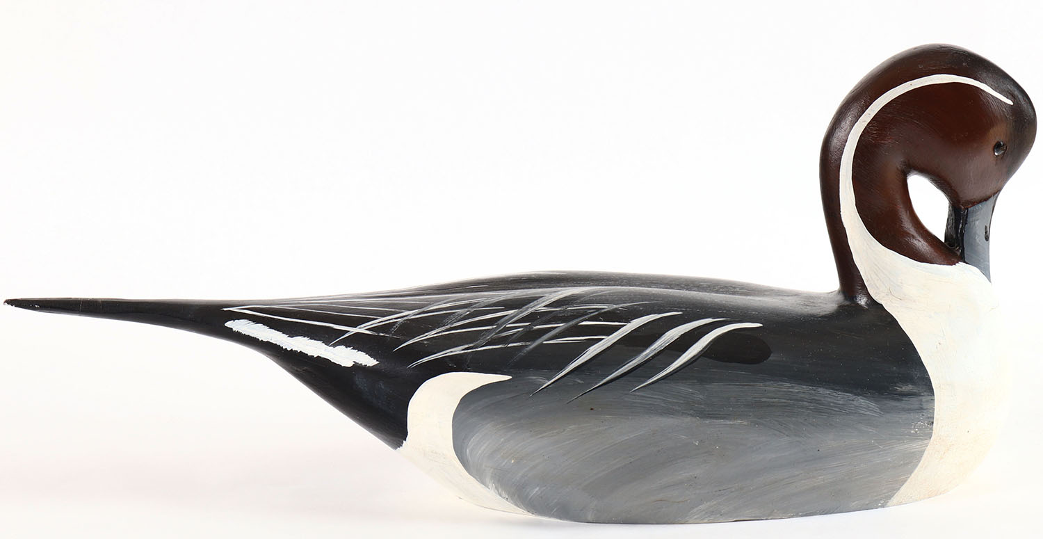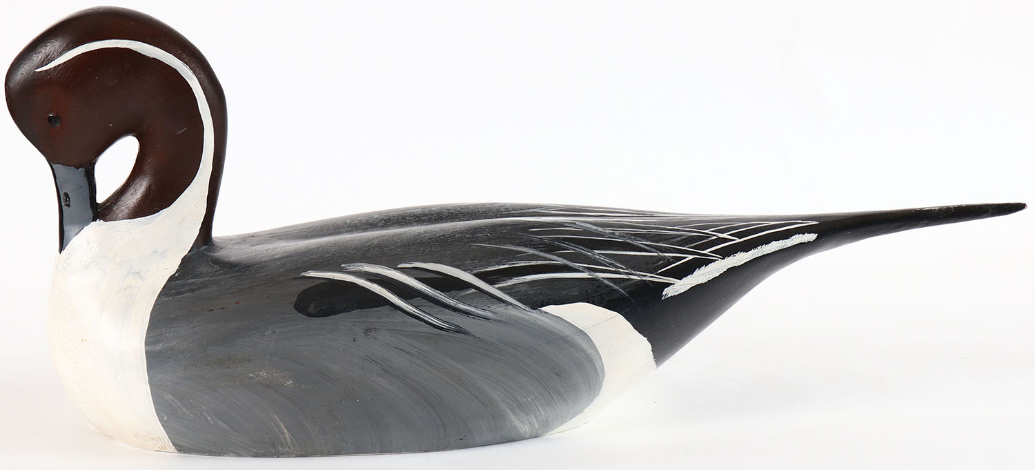 Preening Pintail Drake by Bill William Goenne, King City, CA, glass eyes, hollow wood, original paint, structurally excellent, branded WRG on bottom. Grade: Excellent + - Value: 70 to 150