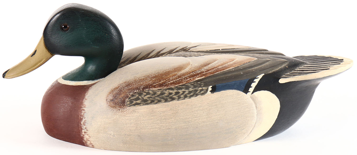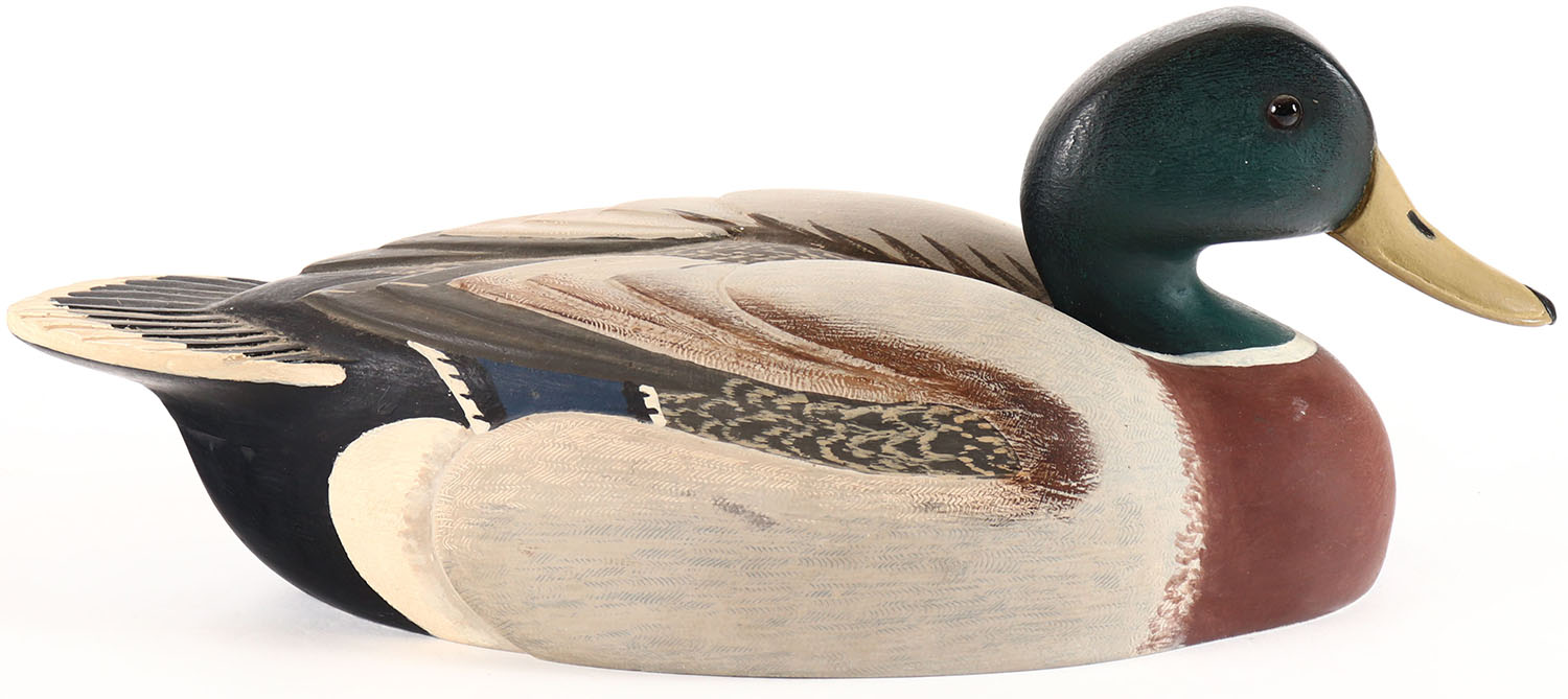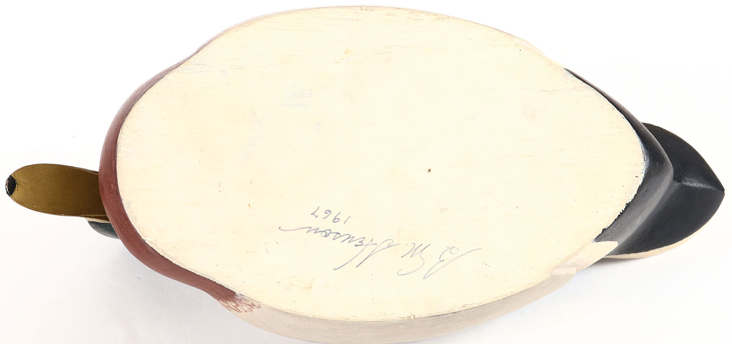 Mallard Drake by B.M. Henson, glass eyes, solid wood, original paint, signed on bottom, structurally excellent. Grade: Excellent + - Value: 30 to 60