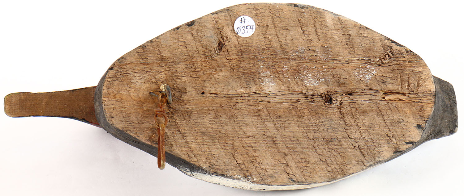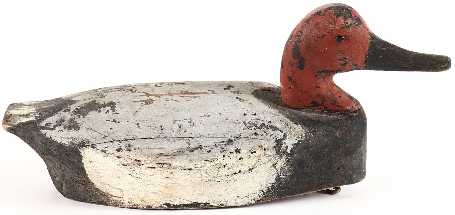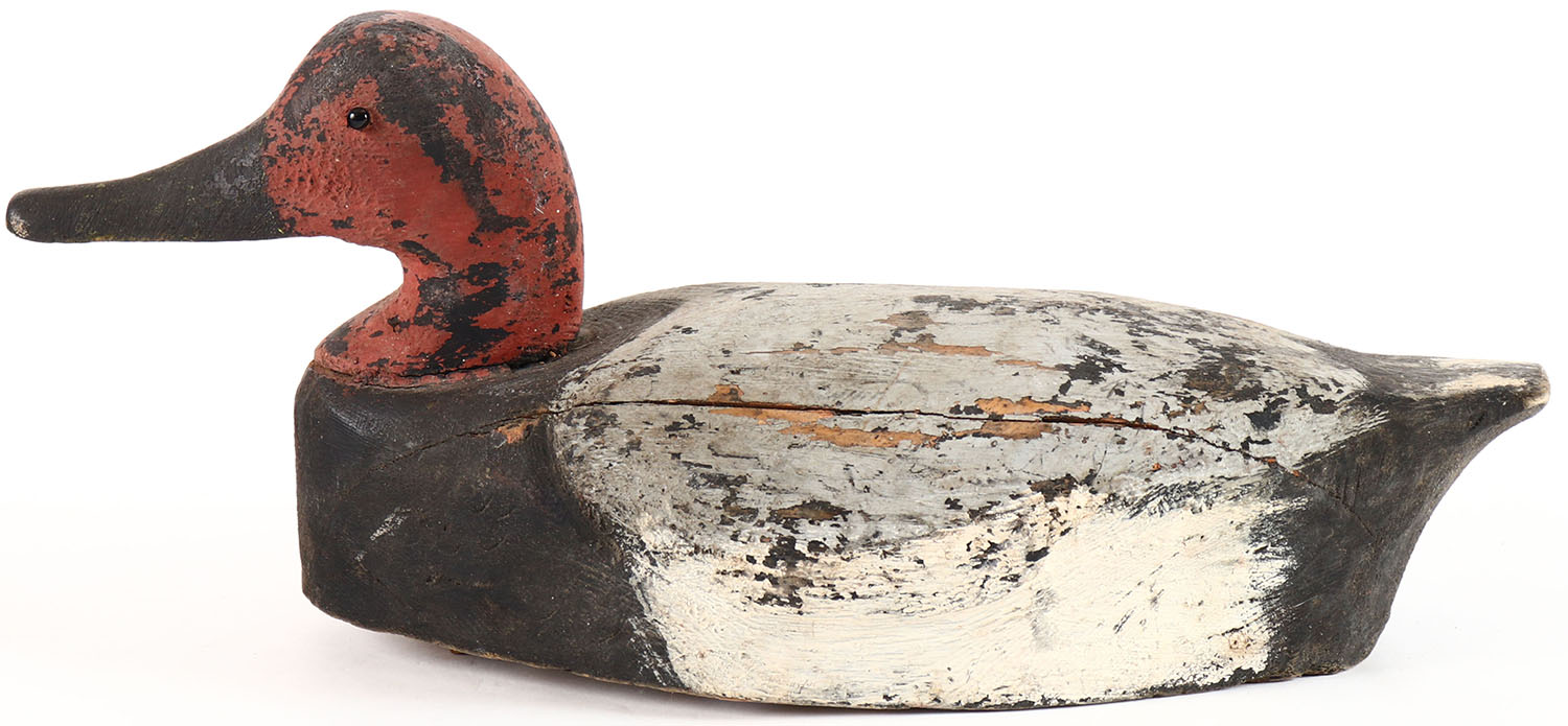 Canvasback Drake by unknown maker, glass eyes, solid wood, original paint, has age cracks on back. Grade: Very Good ++ - Value: 10 to 30