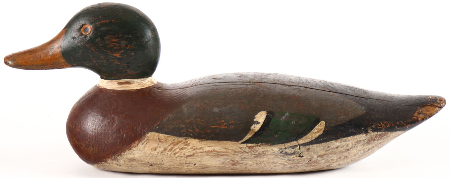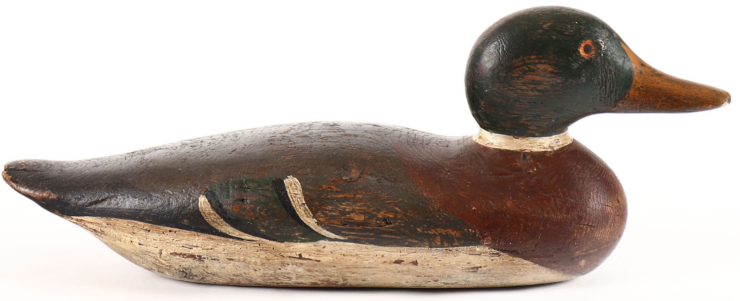 Mallard Drake by Mason Decoy Company, Detroit, MI, 1896-1924, painted eyes, solid wood, restored and aged paint, structurally excellent. Grade: Very Good ++ - Value: 30 to 60