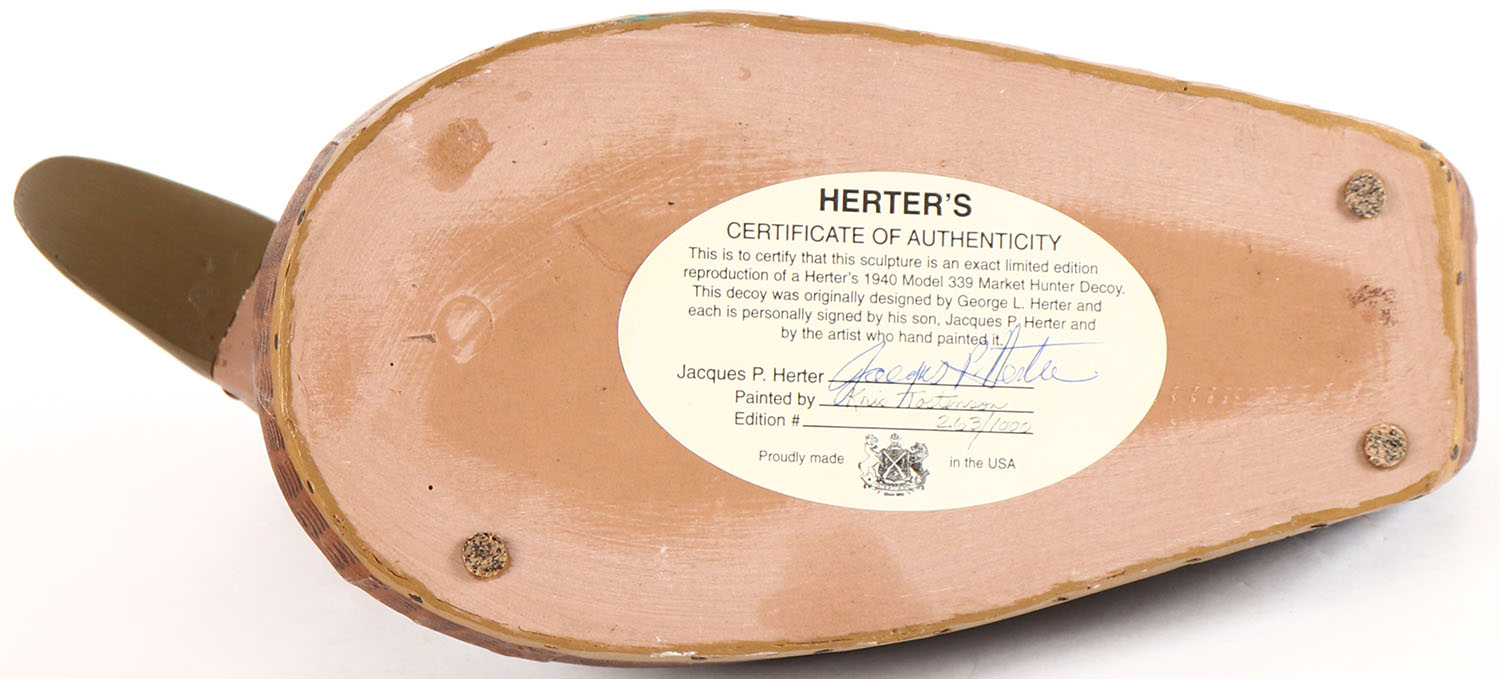 Black Duck by Herter's Inc. glass eyes, reproduction series, canvas over cork, original paint, structurally excellent. Grade: Excellent + - Value: 20 to 40