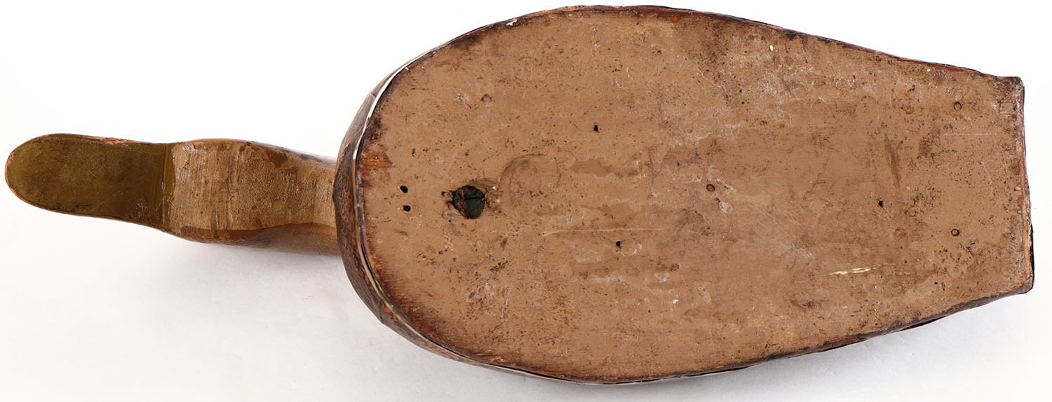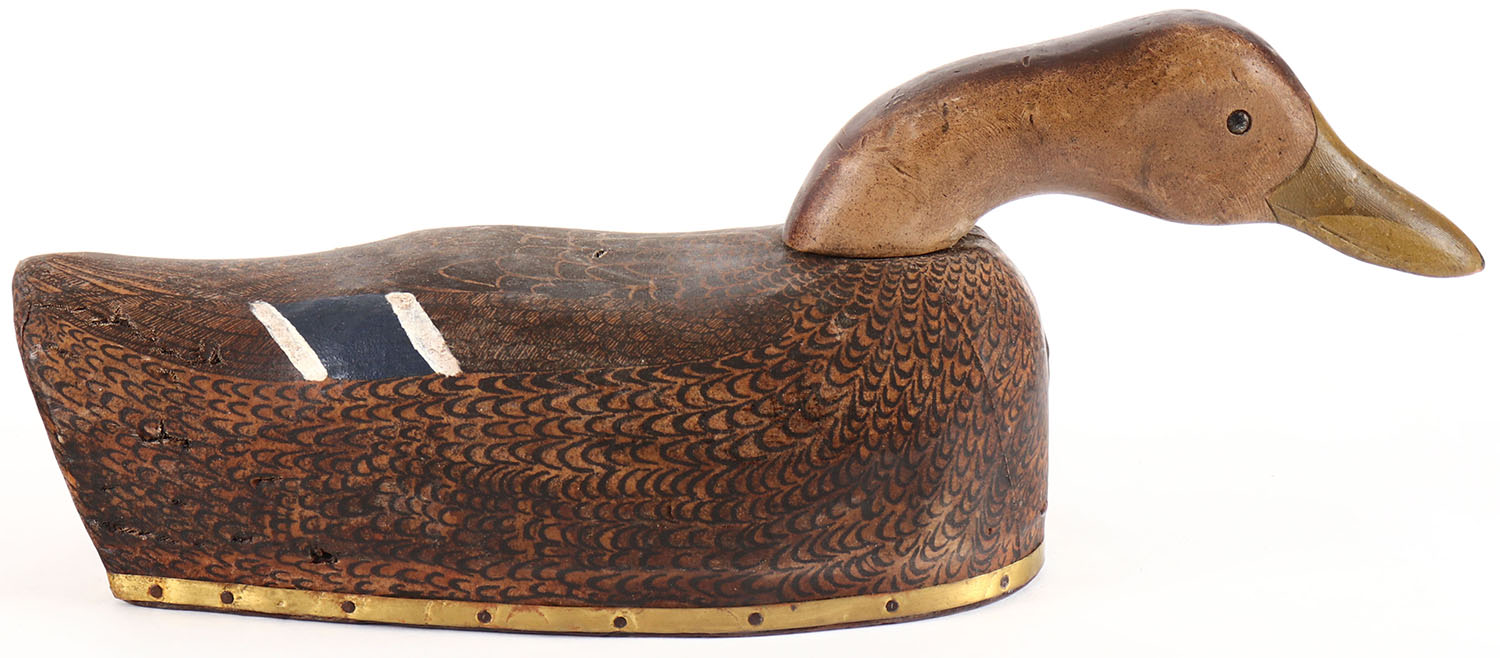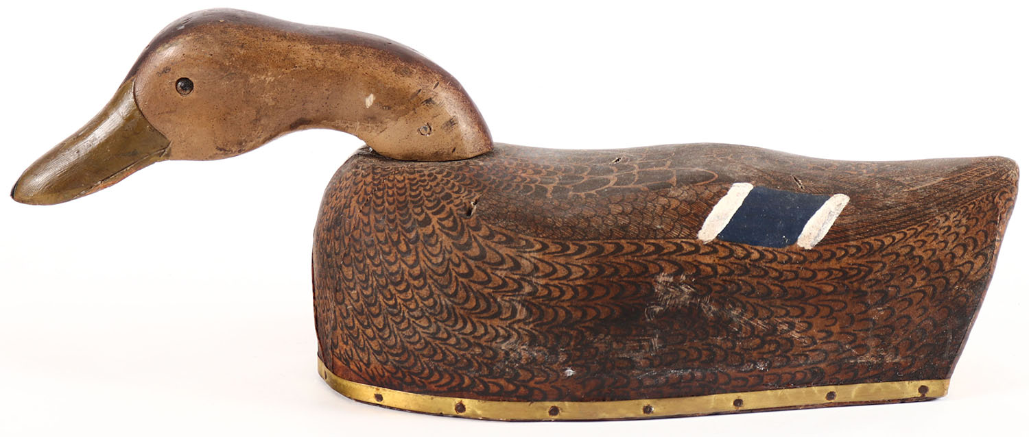 Swimming Hen Mallard by Herters Decoy Co., Waseca, MN, glass eyes, rare swimming model, canvas over cork, original paint with possible speculum strengthening, structurally excellent. Grade: Excellent - Value: 100 to 200